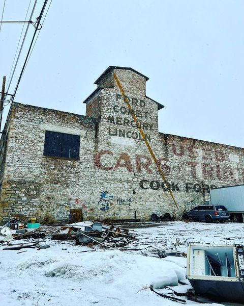 The former Cook Ford dealership building in downtown Sheridan, WY at Gould & 5th St. Rising a few stories higher than the 3,743ft of elevation it is built upon, the building is found along the Sheridan Railroad Historic District, which is listed on the National Register of Historic Places.