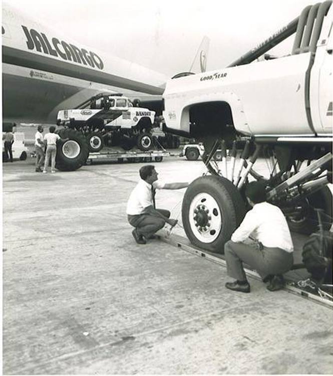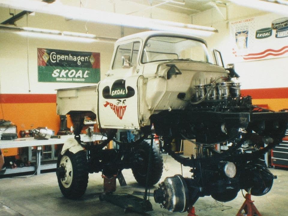 “After we walked away from King Kong, we’d pretty much decided that we were going to do a Skoal Bandits monster truck. This was late 1983 I think, by the way. Something like that. In any case, the next booth we came to, the VERY next booth, was a guy selling hopped-up old Jaguar V-12’s that had been removed from their cars and replaced with 350ci Chevy small blocks. Well, this guy was taking those V-12’s and souping them up and making them pretty high performance. After about 15 minutes of talking, we tell the guy that we’re building a truck for Skoal, and we want to know if he’d supply us with a powerplant. He said ‘Sure!’ and that was pretty much it. We hadn’t even talked to anyone at Skoal about our idea to build a monster truck, and he we are already rounding up parts!”