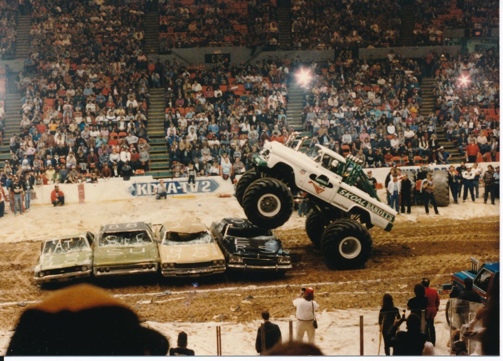 The Metrodome (Minneapolis, MN – 1987) Jim Ries is behind the wheel of the green and black Skoal Crusher, the third and newest of the Skoal trucks at the time. A similar track setup to Buffalo, but with two small sets of cars in the middle of the track rather than one long set, and importantly no dirt ramps. His nemesis Jim Kramer and BIGFOOT #6 charge to a very early lead, leaving Ries fumbling to close his tray-table and return his seat to the upright and locked position before both drivers take turns playing “airplane” on different sets of cars. Ries skies the Crusher out on the first set, no doubt in panic-mode and trying to play catch-up on Kramer. Kramer glides low over the first set, treating the 3-car set like a motocross double: up the first car, clear the second, back down the third. At this point Kramer has to become aware of Ries’ impending return to the front of this race, as the Crusher’s mega-launch off the first set conveniently sends it into a pseudo-slap-wheelie that Ries is able to carry across the second 3-car stack. Kramer feeds a couple extra shovels of coal into BIGFOOT #6’s furnace and achieves a low-orbit pass of his own off the second set, but is rewarded with a rough side-slap. Somehow the front end is still holding together under the Skoal Crusher, but Kramer’s forward momentum combined with a stumble hands a win to BIGFOOT that very easily could have gone the other way.