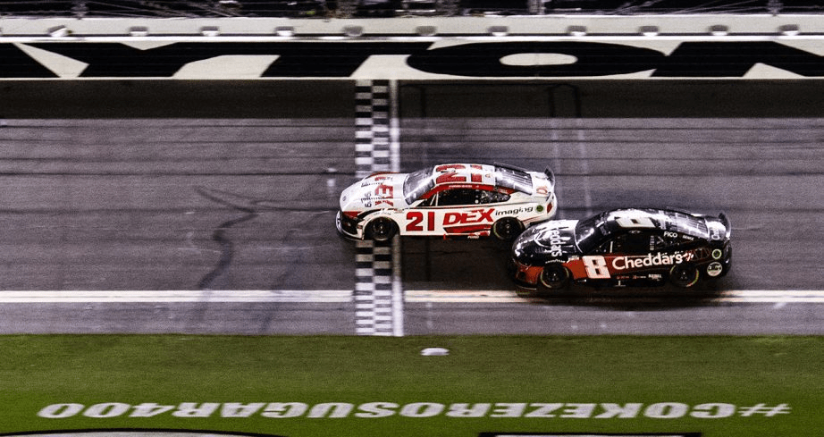 As final Overtime restart lit off, Burton and his #21 Wood Brothers Ford battled side-by-side on the front row alongside 2-time NASCAR champion Kyle Busch in the Richard Childress Racing #8 Chevrolet, each driver receiving aggressive bumps from the cars drafting immediately behind them. To be sure, these shoves weren’t the product of the drivers behind attempting to shove either Burton or Busch to a win; rather, they were trying to cast them so far out front of the pack that they would lose the draft, slow, and become easy targets for a last-second pass for the win.
